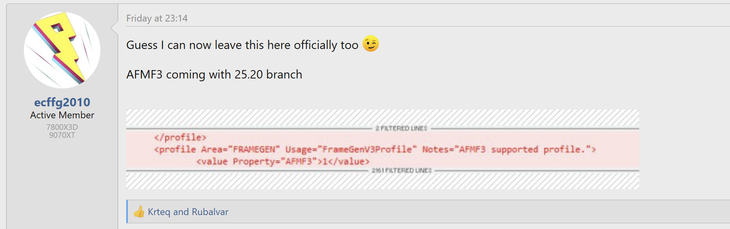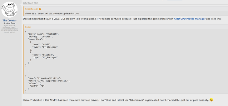 根據(jù)用戶“The Creator”和“ecffg2010”的發(fā)現(xiàn),在最新的AMD Radeon軟件測(cè)試版本中,盡管官方發(fā)布說明和軟件圖形界面中均未提及AFMF 3,但通過AMD GPU配置文件管理器導(dǎo)出游戲配置文件后,清晰地顯示了新版本的存在。社區(qū)推測(cè),AFMF 3很可能將隨AMD的25.20驅(qū)動(dòng)分支正式亮相,而該分支預(yù)計(jì)將配合備受期待的FSR Redstone更新一同發(fā)布。