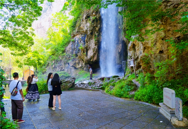 水質(zhì)潔凈甘冽,沿絕壁飛落,形成落差93米、45米等多級瀑布,“如白練之經(jīng)于天,白虹之飲于泉”,堪稱“燕趙第一瀑”。