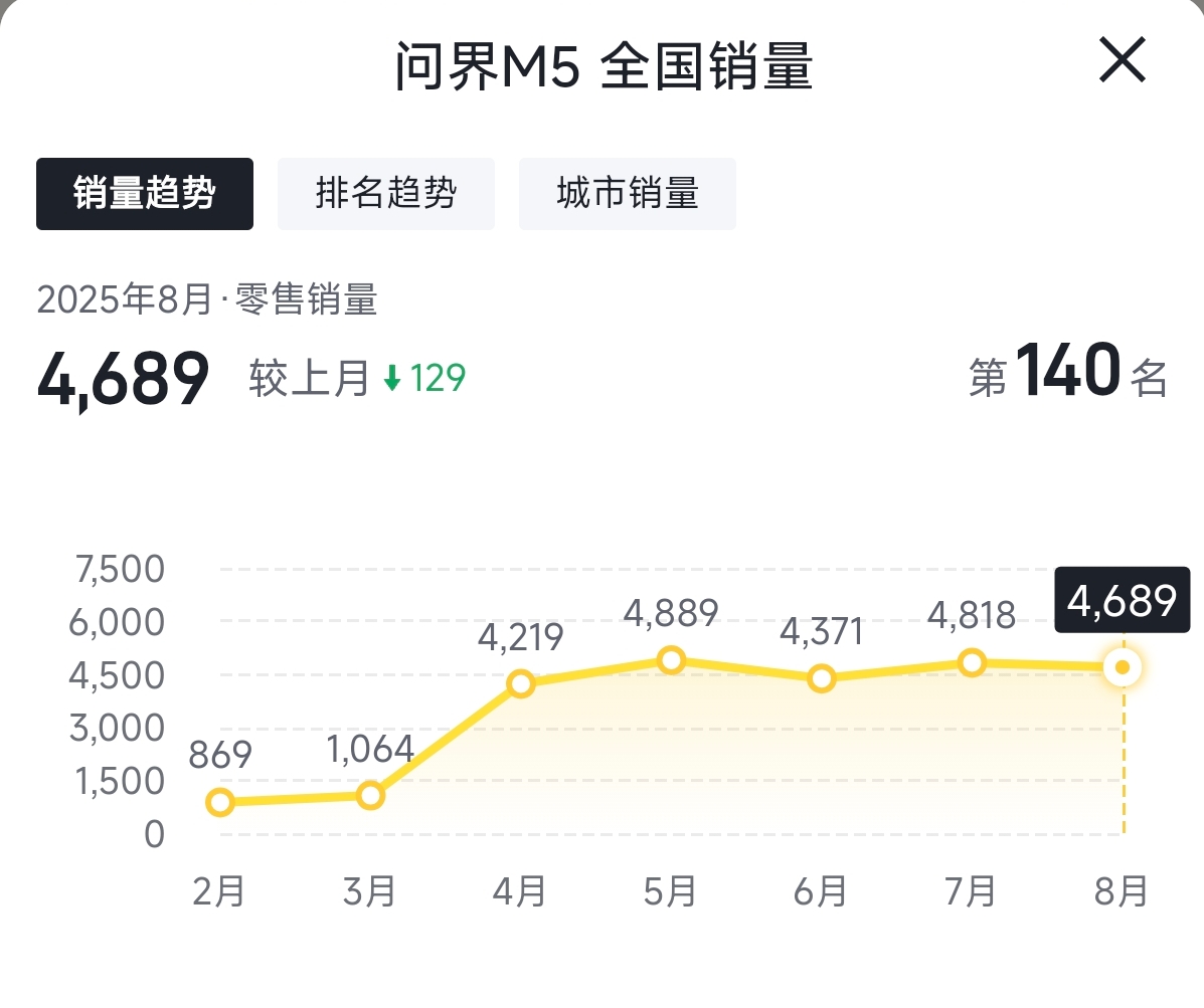 根據(jù)銷量統(tǒng)計,2025年2月至8月,問界新M5 Ultra的零售銷量呈現(xiàn)波動上升趨勢:從4月銷量突破4000輛后5月至8月銷量均穩(wěn)定在4000輛以上。這一銷量走勢表明,隨著市場對其輔助駕駛與安全實力的認(rèn)知加深,問界新M5 Ultra的用戶接受度正逐步提高。
