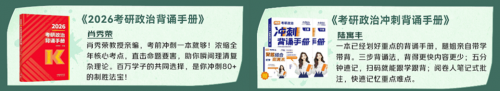 如果你是備戰(zhàn)2026年考研的學(xué)子,那么10月正是復(fù)習(xí)考研政治知識(shí)的關(guān)鍵時(shí)期。由肖秀榮教授親編的《2026考研政治背誦手冊(cè)》,聚焦考研政治核心需求,將全年考點(diǎn)高度濃縮,精準(zhǔn)直擊命題關(guān)鍵,作為歷經(jīng)多年考研實(shí)踐檢驗(yàn)的優(yōu)質(zhì)資料,它深受百萬(wàn)學(xué)子信賴,是考生沖擊80+高分的重要備考工具。另一本由陸寓豐編寫《考研政治沖刺背誦手冊(cè)》,書中獨(dú)創(chuàng)的三步背誦法,可實(shí)現(xiàn)“減負(fù)提速”的記憶效果;“五分鐘速記”配套掃碼學(xué)習(xí)功能,便于考生利用碎片時(shí)間強(qiáng)化記憶;閱卷人視角的筆記式批注,更能幫助考生精準(zhǔn)把握考點(diǎn)重難點(diǎn),為考研政治沖刺階段的復(fù)習(xí)提供科學(xué)指引。