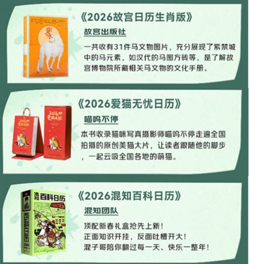 步入2025年第四季度后,2026的步伐也越來(lái)越近,換新日歷即將成為剛需。若你想在使用日歷的同時(shí)感受中國(guó)傳統(tǒng)文化的多元魅力,京東為你帶來(lái)三本佳品。《2026故宮日歷生肖版》以專業(yè)科普視角解讀傳統(tǒng)文化,精選31件故宮馬文物,用日歷形式將文物知識(shí)拆解成每日可讀內(nèi)容,高清呈現(xiàn)文物細(xì)節(jié)的同時(shí)傳遞歷史內(nèi)涵,能幫你輕松搭建對(duì)故宮馬文物的認(rèn)知,是親近傳統(tǒng)文化的優(yōu)質(zhì)入門選擇?!?026愛(ài)貓無(wú)憂日歷》以萌寵治愈為切入點(diǎn),將萌貓與中式場(chǎng)景巧妙融合。翻閱時(shí),你既能在萌貓的可愛(ài)形象中獲得慰藉,又能潛移默化地接觸傳統(tǒng)文化元素,讓傳統(tǒng)文化多一份溫度與情感共鳴。由混知團(tuán)隊(duì)編寫的《2026混知百科日歷》,給你帶來(lái)頂配新春禮盒,搶先上新誠(chéng)意滿滿。日歷設(shè)計(jì)獨(dú)具巧思,正面知識(shí)干貨滿滿,反面吐槽幽默風(fēng)趣,讓傳統(tǒng)文化知識(shí)以最有趣的方式貼近你的生活!