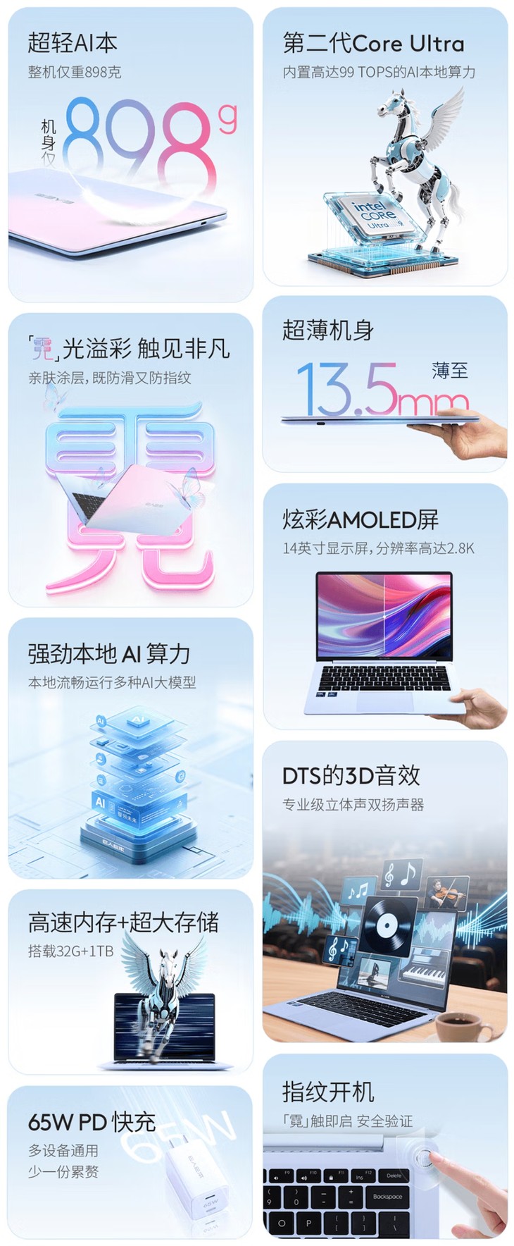 性能方面,該筆記本聚焦于輕薄便攜與高性能的融合。它搭載了第二代英特爾酷睿Ultra處理器,為用戶提供Ultra 5-225H和性能更強(qiáng)勁的Ultra 9 285H兩種配置可選,后者最高主頻可達(dá)5.4GHz。同時,它集成了英特爾Arc GPU,足以保障日常辦公、應(yīng)對創(chuàng)意設(shè)計乃至輕度游戲。尤為突出的是,該機(jī)內(nèi)置高達(dá)99 TOPS的本地AI算力,能夠流暢運(yùn)行多種AI大模型,為用戶賦予強(qiáng)大的智能體驗(yàn)。全系機(jī)型均標(biāo)配32GB LPDDR5x 8533MHz高速內(nèi)存和1TB PCIe 4.0 SSD,確保多任務(wù)切換順滑且存儲空間充足。