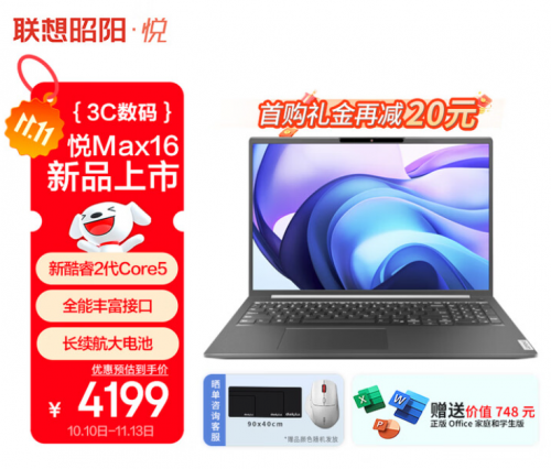 想要換新輕薄本的消費者可以選擇聯(lián)想昭陽·悅Max16 25新款輕薄本。薄至16.9mm,輕至1.72kg,方便攜帶,同時180°開合角度,與同事共享內容更便捷。配置指紋識別,更安全。內置71Wh超大容量電池,支持15小時續(xù)航,續(xù)航持久。支持雙攝融屏、臨時分身、會議摘要,開會更便捷。聯(lián)想昭陽·悅Max16新酷睿2代Core5 16G 1T 25新款輕薄本京東原價4199元,享補貼立減10%,到手價3779.1元。
