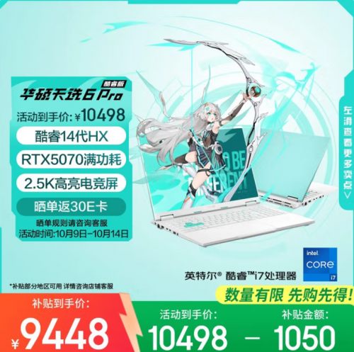 華碩天選6 Pro 酷睿版 16英寸游戲本也是相當不錯的選擇。輕約2.25kg,薄至1.79cm,采用全新不對稱斜切設計,輕薄且好看??蛇x擇獨顯輸出、混合輸出、集顯模式、自動調節(jié),選擇更多,體驗更好。支持Windows Hello人臉識別解鎖,解鎖安全且方便。華碩天選6 Pro 酷睿版 16英寸游戲本(i7-14650HX 16G 1T RTX5070 2.5K)青色京東原價10498元,享補貼立減10%,到手價9448.2元。