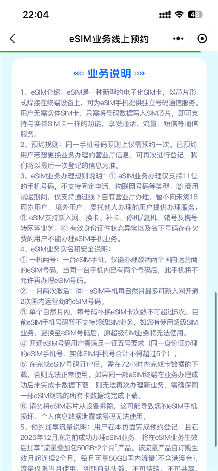 需要注意的是,開通eSIM號碼的用戶必須滿足“一證五號”要求,并且在開戶后的72小時內(nèi)完成卡數(shù)據(jù)的下載,否則將影響后續(xù)業(yè)務(wù)的辦理。這些細(xì)節(jié)對于計劃使用eSIM的用戶來說尤為重要,確保順利完成激活和后續(xù)的操作。