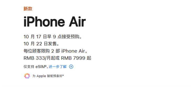 蘋果 CEO 庫克近日現(xiàn)身抖音 Apple Store 直播間,正式宣布 iPhone Air 國行版將于 10 月 17 日早 9 點開啟預購,10 月 22 日全面開售,蘋果中國官網(wǎng)同步更新發(fā)售信息,新機定價 7999 元起。這款被視作年度最受關注的蘋果新品,以 5.6mm 的機身厚度刷新 “史上最薄 iPhone” 紀錄,采用 5 級鈦金屬機身與前后超瓷晶面板,輕量化設計下兼具耐用性。
