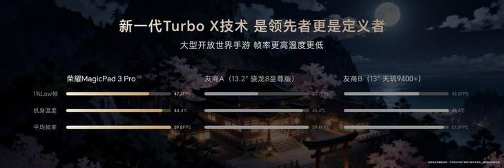 為了實(shí)現(xiàn)極致性能釋放,榮耀MagicPad3 Pro搭載13層冰封散熱系統(tǒng),導(dǎo)熱能力提升26%,并集成新一代Turbo X技術(shù),《鳴潮》游戲幀率與控溫表現(xiàn)均領(lǐng)先友商同級(jí)機(jī)型,《原神》可穩(wěn)定運(yùn)行120幀+2.6K分辨率的高畫質(zhì)設(shè)置,超分超幀表現(xiàn)達(dá)到業(yè)界超強(qiáng)。榮耀還聯(lián)合高通業(yè)界首發(fā)PC級(jí)Q-Sync技術(shù),對(duì)齊屏幕刷新率與游戲幀率,絲滑顯示無(wú)懼延遲撕裂,讓玩家看得爽,操控更爽。