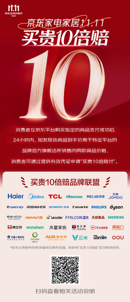同時(shí),為了更好滿足消費(fèi)者的需求,10月14日,京東針對家電家居領(lǐng)域發(fā)布了“買貴10倍賠”活動,覆蓋海爾、海信、美的、TCL、格力、小米等一眾知名家電家居頭部品牌。致力于為用戶打造一個(gè)“真低價(jià)、無套路”的省心購物體驗(yàn),讓每一位消費(fèi)者都能輕松選購“又好又便宜”的家電家居產(chǎn)品。消費(fèi)者在京東購買帶有“買貴10倍賠”標(biāo)識的商品后,如果發(fā)現(xiàn)商品購買價(jià)高于特定平臺特定店鋪的同款產(chǎn)品售價(jià)可得到相應(yīng)賠付。打開京東APP,搜索“買貴10倍賠”,即可參與活動,一鍵解鎖更多低價(jià)家電家居好物。