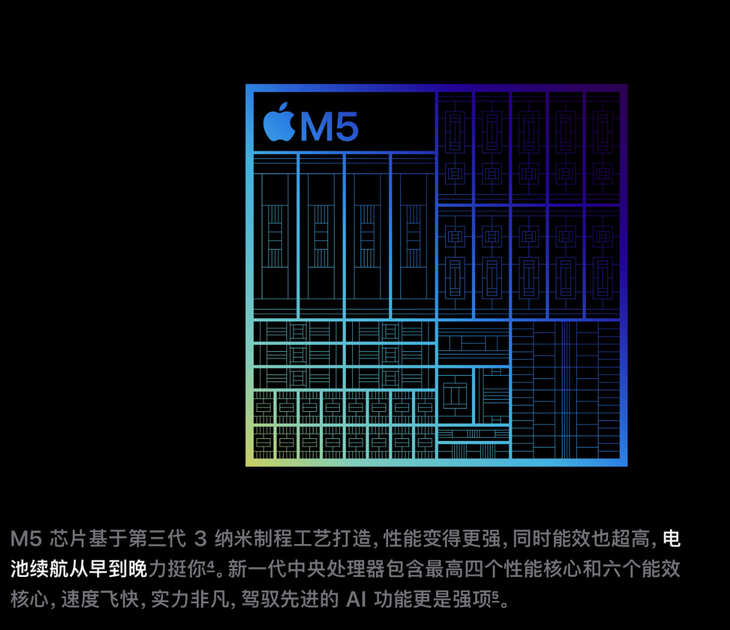 CPU方面,M5采用4個性能核心+6個高能效核心的架構,帶來業(yè)內(nèi)領先的單核與多核處理速度,同時兼顧能效,優(yōu)化續(xù)航表現(xiàn)。搭配16核心神經(jīng)網(wǎng)絡引擎,本地AI推理能力顯著增強,可輕松應對復雜的機器學習任務。