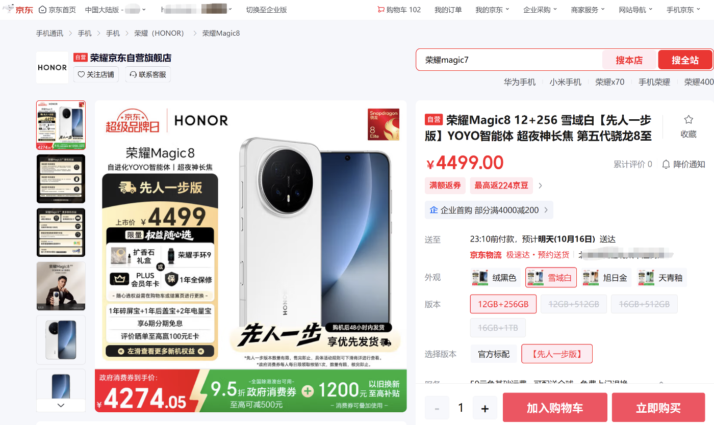 4274元起!來京東11.11參與榮耀Magic8系列預(yù)售 可享9.5折政府消費(fèi)券