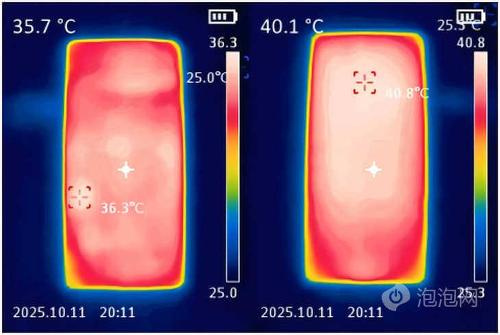 經過安兔兔實測,手機跑分為4194202分,在連續(xù)兩輪跑分之后,機身正面溫度最高為36.3℃,背面溫度最高為40.8℃。通過熱成像儀的圖片可以看出,紅魔游戲手機11 Pro的熱量分布均勻,這樣也有利于機身的整體散熱,從而降低機身的溫度。