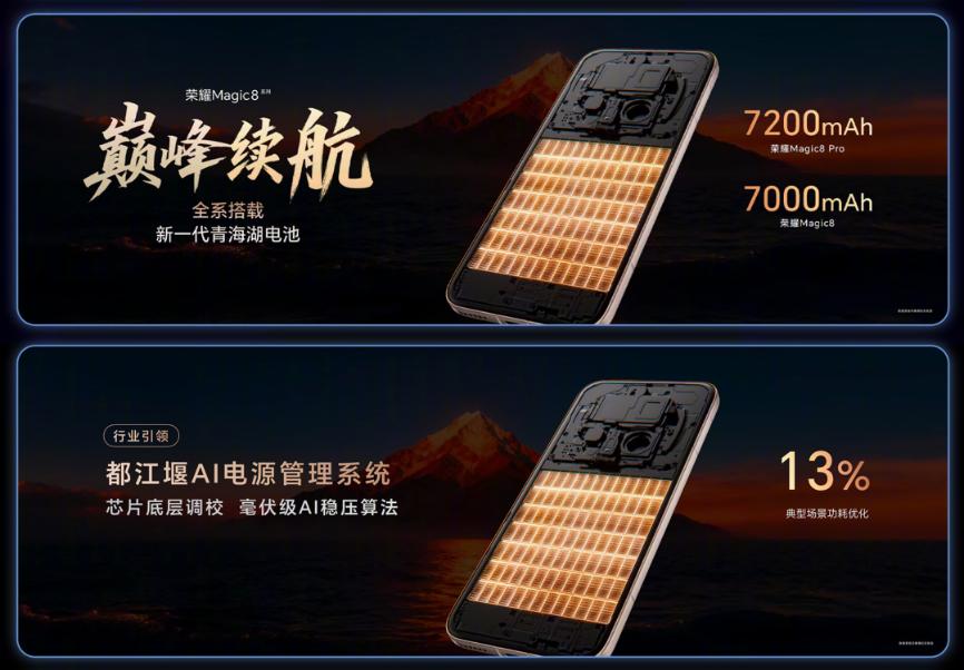 續(xù)航方面,榮耀Magic8系列全系搭載新一代青海湖電池,其中Pro版電池容量為7200mAh,標(biāo)準(zhǔn)版為7000mAh,再搭配榮耀都江堰AI電源管理系統(tǒng),續(xù)航表現(xiàn)更持久;支持最高120W有線超級(jí)快充+80W無(wú)線超級(jí)快充組合,快速補(bǔ)能無(wú)需長(zhǎng)時(shí)間等待。