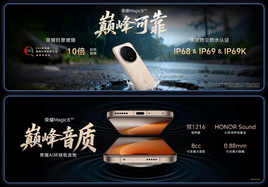 其他配置上,榮耀Magic8系列還擁有3D人臉識(shí)別(僅Pro版)+3D超聲波指紋識(shí)別解鎖、榮耀巨犀玻璃、IP69K+IP69+IP68頂規(guī)防塵抗水、榮耀AI環(huán)繞低音炮、三位一體AI反詐等多項(xiàng)旗艦配置。