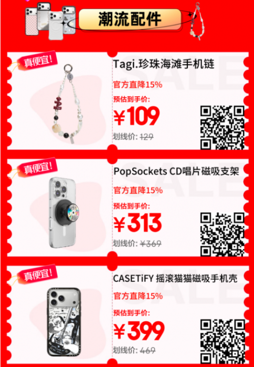 想讓手機(jī)配件不撞款還夠潮?這些潮流配件值得入手。CASETiFY搖滾貓貓磁吸手機(jī)殼,適用于iPhone 17系列手機(jī),酷感搖滾貓圖案,極具個(gè)性。日常價(jià)469元,京東11.11預(yù)估到手價(jià)399元。Tagi珍珠海灘手機(jī)鏈,靈動(dòng)的珍珠、貝殼點(diǎn)綴于手掌間,為日常搭配增添了浪漫元素。日常價(jià)129元,京東11.11官方直降15%,預(yù)估到手價(jià)109元;PopSockets CD唱片磁吸支架,復(fù)古CD造型,聽(tīng)歌追劇都適用。日常價(jià)369元,京東11.11預(yù)估到手價(jià)313元。