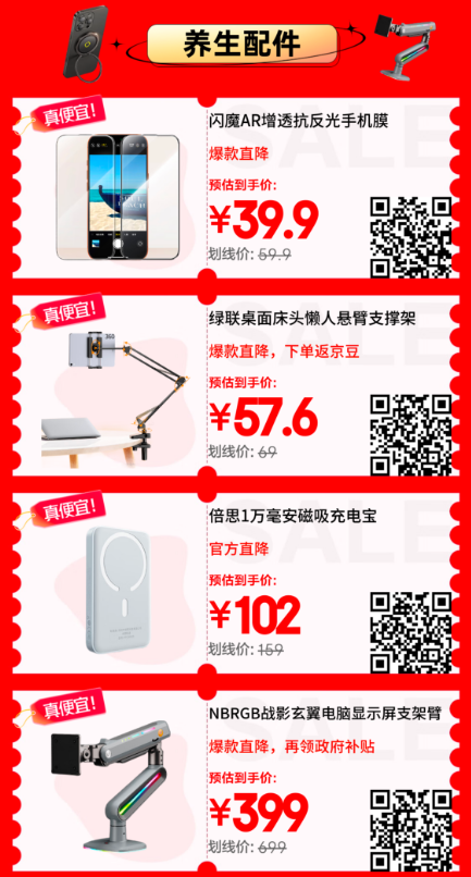 長(zhǎng)時(shí)間使用電子產(chǎn)品,不僅需要護(hù)眼,更需舒適配件的貼心守護(hù)。閃魔手機(jī)膜,具備AR增透抗反光功能,有效緩解長(zhǎng)時(shí)間使用帶來(lái)的視覺(jué)疲勞,京東11.11預(yù)估到手價(jià)39.9元;綠聯(lián)懶人懸臂支撐架,支持手機(jī)與平板多角度調(diào)節(jié),躺臥追劇也能徹底解放雙手,保護(hù)頸椎,京東11.11預(yù)估到手價(jià)57.6元;NBRGB占影玄翼電腦顯示屏支架臂,支持自由懸停,全面釋放桌面空間,京東11.11預(yù)估到手價(jià)399元;倍思1萬(wàn)毫安磁吸充電寶,超薄設(shè)計(jì)減輕手腕負(fù)重,磁吸快充兼顧便捷與健康,京東11.11預(yù)估到手價(jià)102元。