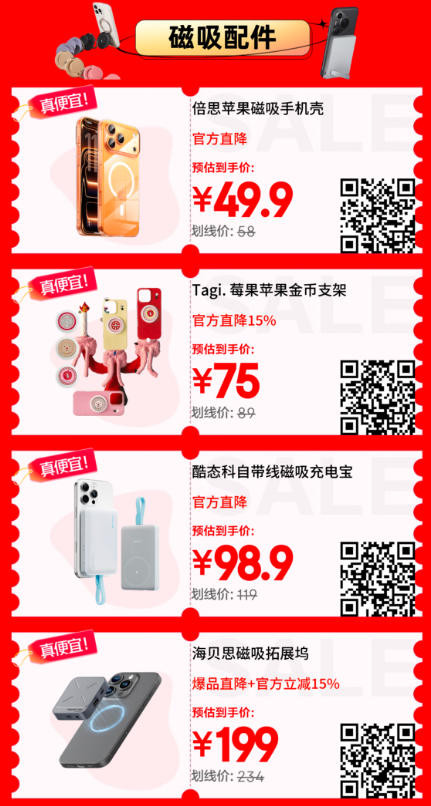 告別繁雜線材,磁吸配件讓連接更輕松、使用更自由。倍思蘋(píng)果磁吸手機(jī)殼,有效防止刮擦,強(qiáng)磁吸附兼容多種配件,支持無(wú)線充電與車(chē)載導(dǎo)航,京東11.11預(yù)估到手價(jià)49.9元;Tagi莓果蘋(píng)果金幣支架,一貼即合,多角度自由支撐,京東11.11預(yù)估到手價(jià)75元;酷態(tài)磁吸充電寶,自帶線材,吸附即充,出行更便捷,京東11.11預(yù)估到手價(jià)98.9元;海貝思磁吸拓展塢,輕松擴(kuò)展多種接口,移動(dòng)辦公更高效,京東11.11爆品直降疊加官方立減15%,預(yù)估到手價(jià)199元。