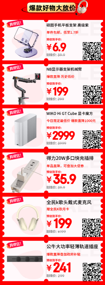 此外,京東11.11還有多款高性?xún)r(jià)比3C配件持續(xù)放價(jià)。其中,碩圖手機(jī)平板支架限時(shí)1.7折,單件包郵,預(yù)估到手價(jià)只需6.9元;NB顯示器支架機(jī)械臂爆款直降,預(yù)估到手價(jià)199元;WIKO Hi GT Cube顯卡魔方,爆款直降1000元,預(yù)估到手價(jià)2999元;全民K歌頭戴式麥克風(fēng),預(yù)估到手價(jià)199元,還贈(zèng)全民K歌月卡;得力20W多口快充插排,單品直降還可疊加大促券,預(yù)估到手價(jià)35.9元;公牛大功率輕薄軌道插座,爆款直降疊加政府補(bǔ)貼后預(yù)估到手價(jià)241元。