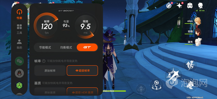 電競獨(dú)顯芯片R1的加入讓真我GT8 Pro支持超幀超分并發(fā),包括《原神》、《崩壞:星穹鐵道》這兩款游戲都可以實(shí)現(xiàn)2K+120FPS的超分超幀并發(fā)模式,實(shí)現(xiàn)游戲畫質(zhì)與幀率的雙重升級。