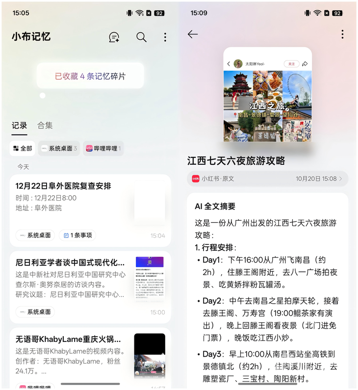 AI方面,真我GT8 Pro也支持小布記憶,通過三指上滑即可開啟AI一鍵閃記,AI會(huì)識別分析當(dāng)前屏幕顯示的內(nèi)容,并存入小布記憶當(dāng)中,支持識別日期并添加到日程當(dāng)中,還可以幫你梳理旅游攻略,讓你的旅游出行更簡單。