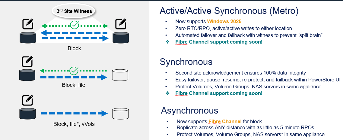 其中,雙活模式現(xiàn)已通過Windows Server 2025驗證,結(jié)合自動故障切換與第三方站點(diǎn)見證,可為關(guān)鍵的工作負(fù)載提供無縫的保護(hù)。同步復(fù)制功能適用于企業(yè)塊存儲和企業(yè)文件工作負(fù)載。所有復(fù)制任務(wù)均可通過統(tǒng)一的PowerStore管理器界面進(jìn)行直觀管理,實現(xiàn)便捷的故障切換與業(yè)務(wù)恢復(fù)。