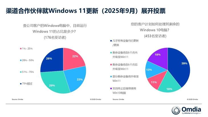 PC渠道合作伙伴的調查進一步揭示了過渡進程的挑戰(zhàn)。在2025年9月對453名受訪者的調研中,僅39%表示其客戶基本完成PC的更新或升級。值得注意的是,18%的受訪者稱其客戶計劃在支持結束后繼續(xù)使用Windows 10,其中多數(shù)可能采用微軟提供的擴展安全更新方案。這意味著微軟、OEM廠商及渠道伙伴仍需投入大量資源,推動剩余用戶群體的遷移工作。