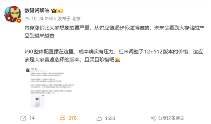 此次調(diào)價(jià)的背后,是席卷整個(gè)電子行業(yè)的存儲(chǔ)漲價(jià)浪潮。數(shù)碼博主 “數(shù)碼閑聊站” 透露,內(nèi)存漲價(jià)比市場(chǎng)預(yù)期更為嚴(yán)峻,這一成本壓力正從供應(yīng)鏈端逐步向消費(fèi)端傳導(dǎo),未來(lái)大存儲(chǔ)容量的電子產(chǎn)品價(jià)格上漲將成為大概率事件。對(duì)于 REDMI K90 而言,其本身堪稱 “堆料旗艦” 的配置進(jìn)一步加劇了成本壓力:標(biāo)準(zhǔn)版搭載驍龍 8 Elite 處理器,配備 7100mAh 硅碳負(fù)極大電池與 120W 有線快充,影像端更是搭載 5000 萬(wàn)像素主攝 + 5000 萬(wàn)像素 3 倍光學(xué)變焦長(zhǎng)焦的越級(jí)組合,再疊加 512GB 的大存儲(chǔ)規(guī)格,在內(nèi)存價(jià)格飆升的當(dāng)下,其成本控制難度可見一斑。