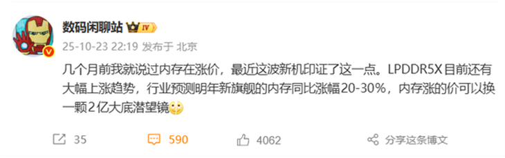 同時(shí),數(shù)碼博主“數(shù)碼閑聊站”也指出,內(nèi)存的價(jià)格漲幅比想象中更大,并且這一波漲價(jià)已經(jīng)開始影響新機(jī)的定價(jià)。他預(yù)測,隨著LPDDR5X內(nèi)存的持續(xù)上漲,明年旗艦機(jī)型的內(nèi)存漲幅可能達(dá)到20-30%,而這種價(jià)格上漲相當(dāng)于可以購買一顆2億大底的潛望鏡頭。