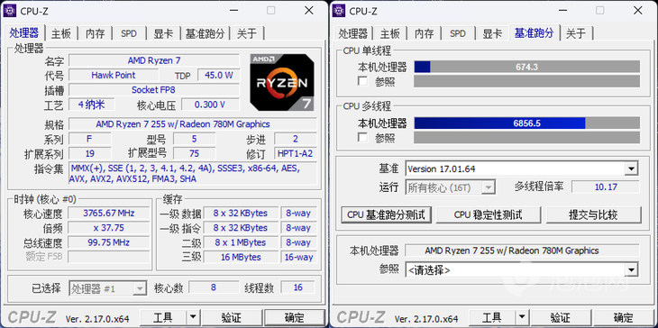 首先是大家熟悉的CPU-Z,銳龍7 H 255單核得到674.3分,多核成績(jī)?yōu)?856.5分。這個(gè)成績(jī)可不是夠用水平。單核夠快,打開大文檔、切換軟件時(shí)不會(huì)有拖沓感;多核夠強(qiáng),就算同時(shí)跑著修圖和輕度剪輯,操作也流暢不卡幀,日常使用和輕度生產(chǎn)力需求完全能輕松hold住。
