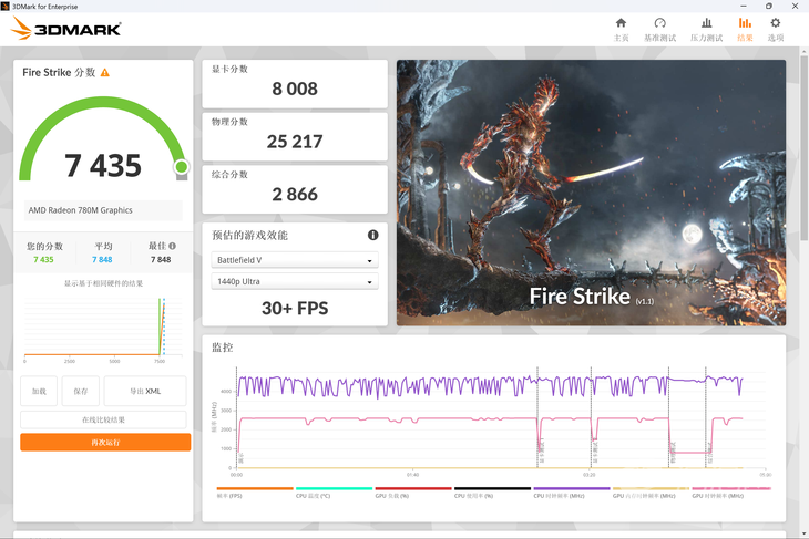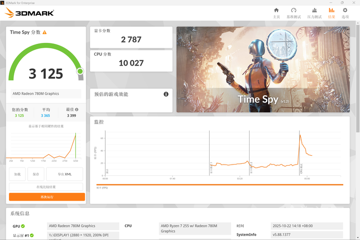 看完CPU,我們?cè)賮砜纯碦adeon 780M核顯的表現(xiàn)如何。在3DMark跑分測(cè)試中,Radeon 780M表現(xiàn)出色,Time Spy顯卡分為2787分,F(xiàn)ire Srike顯卡分為8008分,成績(jī)甚至已經(jīng)接近部分入門級(jí)獨(dú)顯,足以滿足日常使用甚至輕度生產(chǎn)力需求。