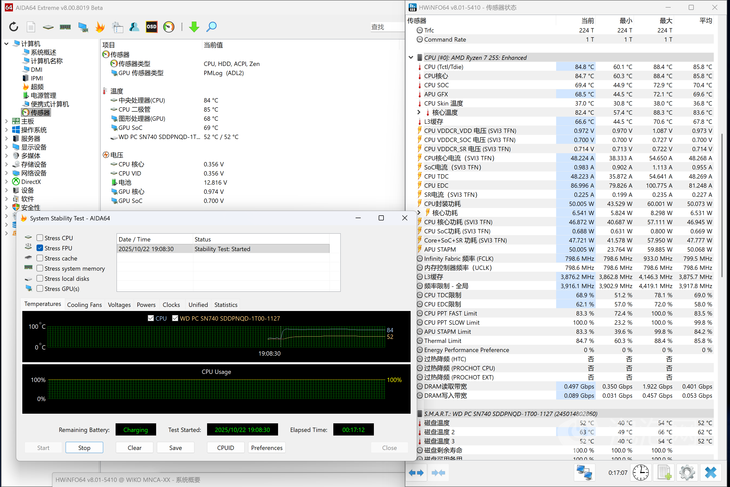 那么Hi MateBook 14銳龍版在這樣輕薄的機(jī)身下,性能釋放表現(xiàn)如何呢?我們使用AIDA64的15分鐘壓力測(cè)試來看看實(shí)測(cè)表現(xiàn)如何。測(cè)試結(jié)果來看,Hi MateBook 14銳龍版的CPU核心溫度平均為85.8°C,此時(shí)CPU的功耗釋放平均為50.073W,整體性能釋放的表現(xiàn)還是非常不錯(cuò)的,在高能模式下可以達(dá)到50W的穩(wěn)定性能釋放。