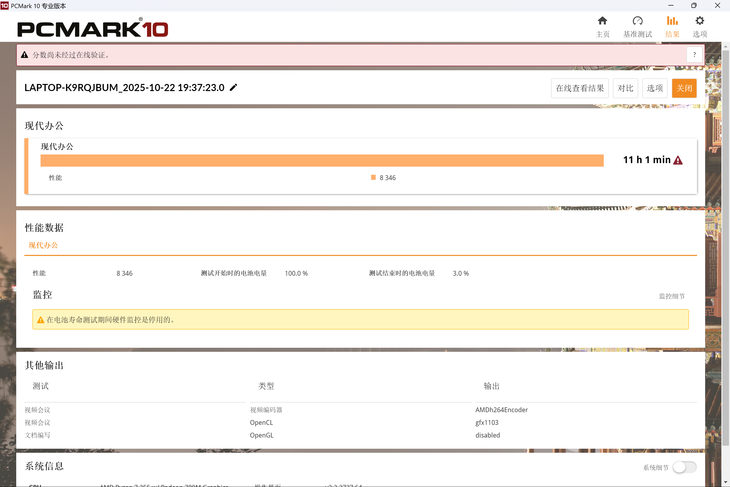 續(xù)航方面,Hi MateBook 14銳龍版配備了70Wh電池。在PCMark 10現(xiàn)代辦公電池續(xù)航測(cè)試中(屏幕亮度50%,開啟WiFi與藍(lán)牙,系統(tǒng)電源模式平衡),Hi MateBook 14銳龍版最終測(cè)試成績(jī)?yōu)?1小時(shí)1分鐘,續(xù)航表現(xiàn)非常出色,可以在保證正常使用的情況下持久續(xù)航一整天。