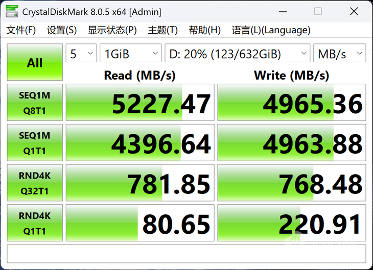 從測(cè)試結(jié)果來看,該硬盤連續(xù)讀寫速度分別為5227.47MB/s、4965.36MB/s,4K隨機(jī)讀寫速度達(dá)到了80.65MB/s和220.91MB/s,擁有主流PCIe 4.0 SSD的水平,搭配1TB的大容量,足以滿足日常使用和游戲的需求。