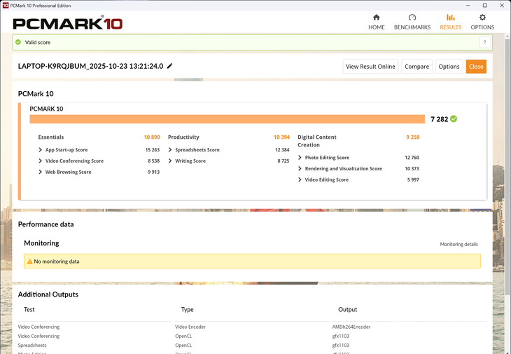 我們?cè)賮砜纯碒i MateBook 14銳龍版配在整機(jī)性能上的表現(xiàn)如何。在PCMark10整機(jī)性能測(cè)試中,Hi MateBook 14銳龍版常用基本功能得分10890,生產(chǎn)力得分為10394,數(shù)位內(nèi)容創(chuàng)作得分為9258,綜合得分為7282,擁有出色的表現(xiàn),不但能夠保證日常辦公等場(chǎng)景下的流暢使用,還可以勝任輕度生產(chǎn)力或是創(chuàng)作。