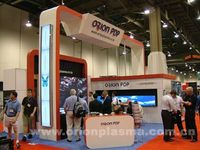 在日前于美國拉斯維加斯舉行的Infocomm 2005展會上,韓國歐麗安(Orion)等離子顯示器株式會社2005年新品“天衣”(英文名稱:Infinte)等離子無限拼接顯示幕墻以其168英寸的超大尺寸和僅僅3~5mm的拼接縫隙征服了與會觀眾。 Orion展臺全景,左側(cè)為一組1×4的異型拼接 &