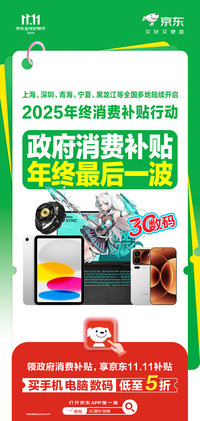 自2025年1月20日手機等數(shù)碼產(chǎn)品購新補貼落地京東以來,眾多消費者來到京東享受國家補貼購買手機、平板、智能手表(手環(huán))等3C數(shù)碼好物。臨近年底,為讓消費者享受到年終最后一波政府消費補貼,11.11京東聯(lián)合上海、深圳、青海、寧夏、黑龍江等多地政府陸續(xù)開啟“2025年終消費補貼行動”,攜手3C數(shù)碼品牌廠商帶來超多爆款好物...