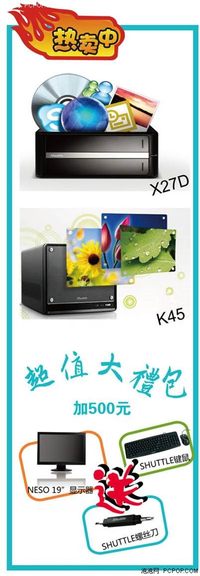 ??? 浩鑫易購網(wǎng)是中國目前唯一專門銷售迷你計算機的購物網(wǎng)站,不僅產(chǎn)品的種類齊全,獨特時尚品味的計算機外型,更是讓使用過的消費者或是第一次見到Shuttle迷你計算機的人都驚嘆不已。 ??? 浩鑫易購網(wǎng)優(yōu)惠多多,驚喜連連,推出特賣風暴: ??? 凡購買K45或X27D,只需加500元即可獲得超值大禮包:NESO LD917W 19”顯示器,SHUTTLE鍵鼠,SHUTTLE精美萬用螺絲刀,