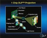 ??? DLP是“Digital Light Processing”的縮寫,它的意思為數(shù)字光處理,它是基于德儀公司開發(fā)的數(shù)字微反射鏡器件DMD來完成顯示數(shù)字可視信息的最終環(huán)節(jié),而DMD則是Digital Micromirror Device縮寫,字面意思為數(shù)字微鏡元件,這是指在DLP技術系統(tǒng)中的核心:光學引擎心臟采用的數(shù)字微鏡晶片,它是在CMOS的標準半導體制程上,加上一個可以調(diào)變反射面的旋轉機構