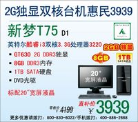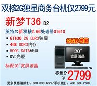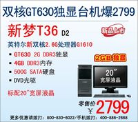 ??? 泡泡網(wǎng)電腦頻道4月3日 新夢T36是一款商務、娛樂兩用的高性價比臺機,一度憑借自身超強性能和實惠的價格博得消費者的親睞。然而,這款臺式電腦近日版本再度升級,新升級的新夢T36 D2將CPU更換為英特爾雙核2.6G處理器G1610,顯卡升級為GT630 2G DDR3獨顯,配合充足的4G內(nèi)存使得其各方面性能都有了顯著提升,特別是3D圖形性能方面更是尤為顯著!此外,500GB的硬盤和20"寬屏