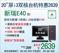 ??? 泡泡網(wǎng)電腦頻道4月10日 對于很多企業(yè)用戶來說,采購辦公電腦主要看重的就是機器的售價和穩(wěn)定的性能!神舟新瑞E40 D1正是這樣一款具有超高性價比的商務機型,它擁有較傳統(tǒng)臺機更省空間的小機箱設計,標配一臺20英寸的寬屏液晶顯示器。配置上,搭載英特爾酷睿i3雙核3.3G處理器2120,內(nèi)置4G DDR3內(nèi)存和英特爾智能高清顯卡,超強的運行速度和流暢的畫面效果無不彰顯著新瑞E40 D1的獨特魅力