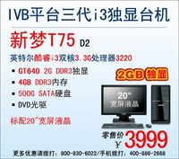 ??? 泡泡網(wǎng)電腦頻道4月22日 神舟新夢T75 D2是一款基于Ivy bridge平臺的商務娛樂全能型臺機!它超強的整機性能非常符合達人們辦公娛樂的雙向需求。它搭載有英特爾酷睿雙核3.3G處理器i3-3220,特別是目前熱售的D2版本將顯卡升級到了GT640 2G DDR3獨顯,能夠充分滿足達人們在3D性能方面的需求。再加上4G內(nèi)存、500G硬盤和20英寸寬屏液晶強悍配備,能完美應對您商務娛樂多