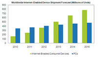 ????泡泡網(wǎng)筆記本頻道8月12日?據(jù)國外媒體報道,近日iSuppli發(fā)表調(diào)查數(shù)據(jù)顯示,2010年互聯(lián)網(wǎng)設(shè)備銷量總計1.61億臺,同期PC銷量則為2.223億。同時,該調(diào)查機(jī)構(gòu)還預(yù)計,截止至2015年P(guān)C銷量或?qū)崿F(xiàn)4.791億臺銷量,而互聯(lián)網(wǎng)設(shè)備則將達(dá)到7.808億部。 2013年互聯(lián)網(wǎng)設(shè)備銷量將超過PC(圖片來源:互聯(lián)網(wǎng)) ????對此,iSuppli分析師喬丹·塞爾布恩表示以上數(shù)據(jù)