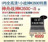 ????泡泡網(wǎng)筆記本頻道1月10日?臨近春節(jié),各大電腦廠商都開(kāi)始新一輪的特惠促銷,其中,神舟電腦戰(zhàn)神系列的優(yōu)惠活動(dòng),恐怕是許多游戲控最為關(guān)注的,今天小編為這些游戲迷送來(lái)利好消息——神舟網(wǎng)銷聯(lián)盟(包括神舟電腦官方商城、淘寶旗艦店、拍拍商鋪和各神舟網(wǎng)銷店)新年大促,其中戰(zhàn)神K350C-i5 D1/K650C-i5 D1均以4999元售價(jià)超值來(lái)襲!這兩款戰(zhàn)神本內(nèi)部配置基本一致,均搭載第四代酷睿處理器i5