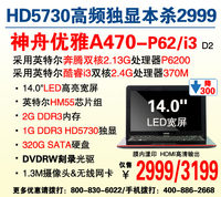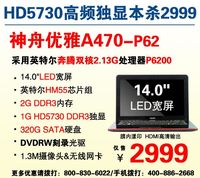 ????泡泡網(wǎng)筆記本頻道9月26日?今天為您奉上是一款不可多得的精品筆記本電腦——神舟優(yōu)雅A470-P62/i3,外觀上,它經(jīng)典的膜內(nèi)漾印A面搭配14吋LED寬屏,時(shí)尚大方。配置上,優(yōu)雅A470-P62/i3搭載強(qiáng)悍的ATI HD5730高頻版獨(dú)立顯卡,為游戲迷們打造專屬的娛樂(lè)空間。為迎國(guó)慶,優(yōu)雅A470-P62/i3狂降三百促銷,實(shí)際成交價(jià)僅2900/3100元,再掀新一輪高性價(jià)比筆記本搶購(gòu)狂潮