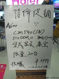 ??? 泡泡網(wǎng)筆記本電腦頻道11月12日 今日小編走訪中關村科貿(mào)電子,在目前市場進入銷售淡季時,海爾旗下新款A600筆記本電腦,打出3999元特價促銷活動,促銷期間送禮包+U盤,商家提醒僅限20臺數(shù)量有限送完為止。此款海爾 A600采用了賽揚M540處理器和120GB硬盤,主頻高達1.86GHz,性價比還是不錯的。海爾 A600促銷海報海爾 A600??? 海爾 A600主色調(diào)仍舊是采用了黑色,上