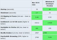 ????泡泡網(wǎng)軟件頻道2月9日?Mac OS X和Windows 8這兩套系統(tǒng)的結(jié)構(gòu)不同,在技術(shù)上沒有可比性,不過它們都是面向普通消費者的操作系統(tǒng),因此在用戶體驗的速度上PCMag對他們進行了一次小范圍的對比,內(nèi)容涵蓋開關(guān)機、處理CD,還有一些跑分軟件的數(shù)據(jù),由于目前Beta版本還沒放出來,因此只能采用之前的開發(fā)者預(yù)覽版來進行測試。 ??? 上圖中綠色區(qū)域代表數(shù)據(jù)領(lǐng)先,原文參考鏈接:http