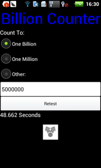 ????泡泡網(wǎng)手機(jī)頻道10月31日?酷派5910近期酷派推出的一款雙核電信手機(jī),采用高通8625雙核1.2GHz主頻+512MB內(nèi)存,性能不錯(cuò),這顆處理器其實(shí)是MSM8225的CDMA版,支持雙模。今天我們帶來(lái)這款手機(jī)的評(píng)測(cè)文章。 CPU測(cè)試:Billion Counter Benchmark ??? Billion Counter Benchmark是測(cè)試手機(jī)數(shù)數(shù)到10億所用的時(shí)間,數(shù)值越小