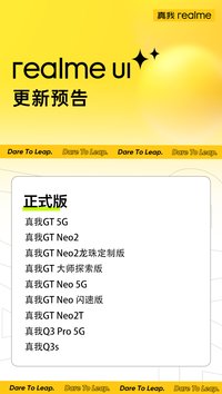 今日,realme社區(qū)發(fā)布了realme UI 的更新預(yù)告,6月27日至7月3日計(jì)劃更新正式版新系統(tǒng)的機(jī)型有:真我GT 5G、真我GT Neo2、真我GT Neo2龍珠定制版、真我GT 大師探索版、真我GT Neo 5G、真我GT Neo 閃速版、真我GT Neo2T、真我Q3 Pro 5G、真我Q3s。