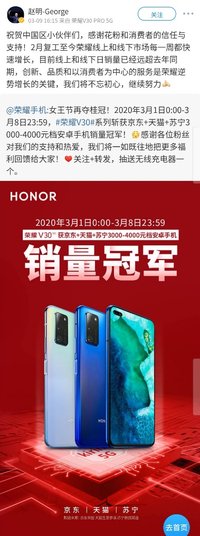 2020年手機(jī)市場延續(xù)了去年的下跌趨勢,疫情影響之下,據(jù)IDC預(yù)測,Q1整個(gè)市場下跌將超過30%%。但是,榮耀手機(jī)卻通過逆勢增長上引來關(guān)注。從榮耀總裁趙明在網(wǎng)上公布的消息看,自2月復(fù)工以來榮耀線上和線下市場每周銷量都在快速增長,日銷量已經(jīng)遠(yuǎn)超去年同期。