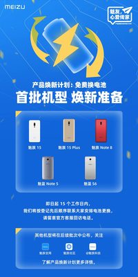 6月27日,魅族社區(qū)公布了「產(chǎn)品煥新計劃」首批參與免費煥新電池的機型:魅族 15、魅族 15 Plus、魅族 Note 8、魅藍(lán) Note 5、魅藍(lán) S6。