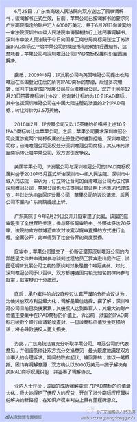 ????泡泡網(wǎng)平板電腦頻道7月2日?據(jù)最新消息,廣東省高級人民法院官方微博剛剛通報了蘋果與唯冠關(guān)于“iPad”商標(biāo)的糾紛結(jié)果,蘋果將向唯冠支付6000萬美元和解費,僵持了幾個月的商標(biāo)案終于塵埃落定。 圖片來源于廣東省高級人民法院官方微博 ??? 日前,蘋果公司已經(jīng)按調(diào)節(jié)要求向廣東高院指定賬戶匯入了6000萬美元,并于6月28日向該案的一審法院深圳市中級人民法院強制執(zhí)行上述民事調(diào)解書,而深圳